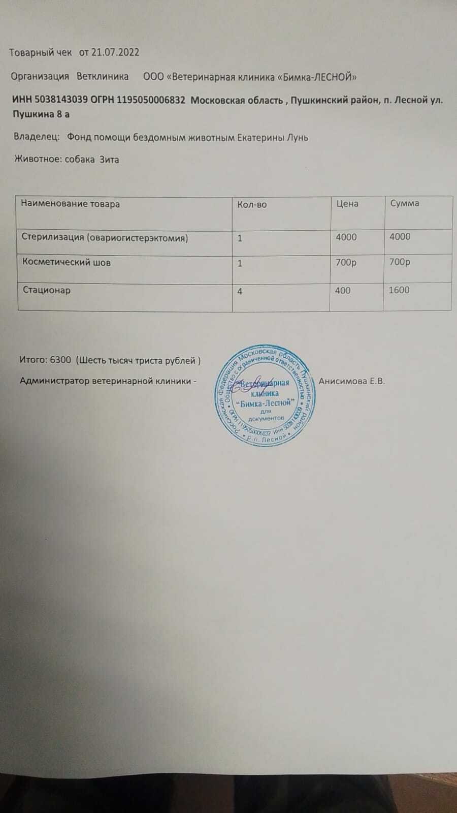 Добрый день! Я Астраханцева Оксана Александровна, прошу помощи в оплате стерилизации двух бездомных щенков, проживающих во Владимирской области, Александровского района, Краснопламенского поселения . Щенки в количестве трёх штук появились в деревне полгода назад, один из них погиб, двое девочек выжили и сейчас им около 10 месяцев. На моём попечение много животных, поэтому сейчас нет возможности самой оплатить стерилизацию, от себя я оплачу услуги ловца, так как собачки не ручные. Благодаря Вашей поддержке счета клиники по стерилизации одной собачки полностью оплачены.
